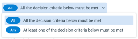 All/Any is also shown at a criteria list, to determine how the criteria listed therein are to be treated at the parent rule’s execution.