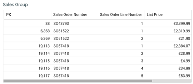 A series of records is displayed, with the columns and order thereof being as defined at the attribute group in the customer view. The maximum number of related records that can be displayed in a table attribute group is defined by its Maximum number of rows property.