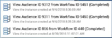 o Open Previous Instance: this button gives access to an audience snapshot’s previous audience instances. If no instances exist, an advisory message is shown on invocation. If one or more audience instances exist, a list is displayed on invocation.