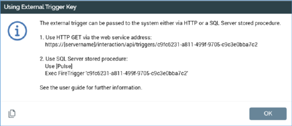 o Information icon. Clicking the icon displays a dialog, which describes how the trigger constraint can be satisfied (using either an HTTP post or a SQL Server stored procedure):