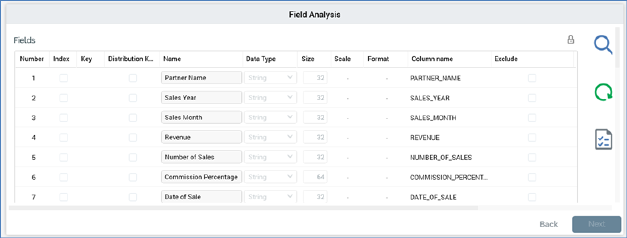 The Definition tab’s Field Analysis panel is used to provide visibility of the data project’s fields.
