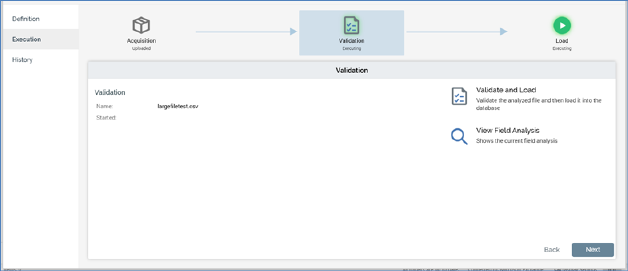 The Execution tab is used to execute a data project. Specifically, it is used to validate and load a data project’s initial file, and upload, validate and load a data project’s second or subsequent files.