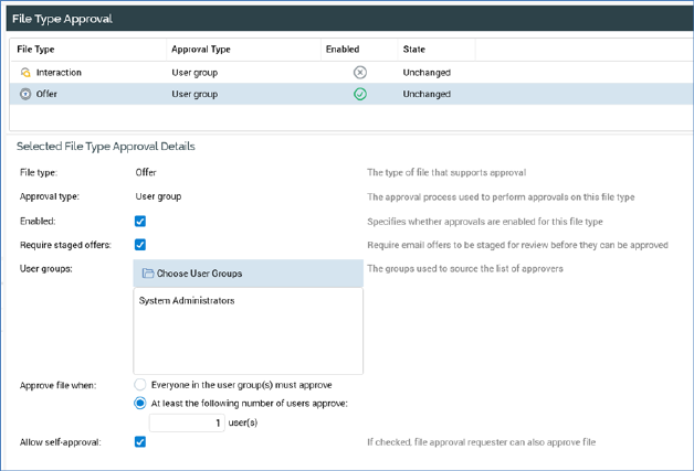 A dedicated configuration interface (File Type Approval) is provided in the Configuration Workbench. Its purpose is to control whether file approvals are enabled or disabled for the file types for which approvals are supported (currently limited to offers and interactions), and also to define the approval criteria that govern each.