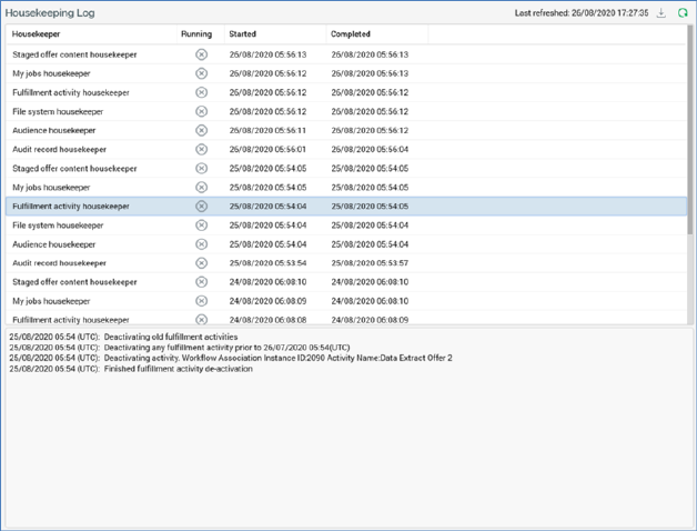 The Housekeeping tab gives you access to RPI housekeeping log messages, which are generated during execution of the RPI housekeeper system task, responsible for running a series of ‘housekeepers’ that assist the RPI server’s optimal performance through the removal of a series of now-irrelevant items – for example, expired workflows, old audit messages, etc.