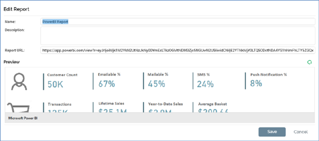 The overlay also contains a preview. You can click Save to persist any changes you have made or Cancel to remove the overlay from display. After editing a report, the report displayed in the Report Viewer is refreshed.