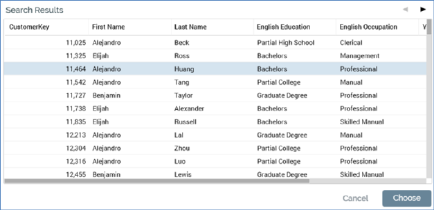 •Choose: this button is enabled when a Search Results record is selected. Invocation removes the Search overlay from display and creates a Customer View job (note that the My Jobs dialog is not displayed). Once the job has completed, the chosen record is displayed in the main Single Customer View interface. Double-clicking a search result has the same effect as clicking Choose.