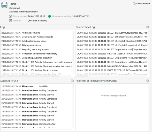 o View Audience Instance: this option is only available when a batch audience or interactive activity configured with an audience is selected at the treeview. Invocation displays the audience instance in the Audience Instance Viewer.