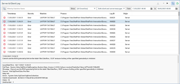The Server & Client Log tab gives you access to RPI server and client log entries.