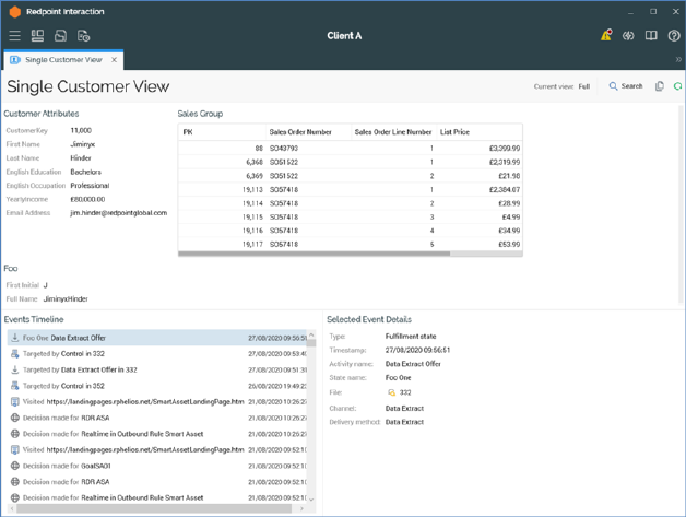 •A timeline of events related to the selected customer (including his having been targeted by interaction activities, having assumed a fulfillment state (e.g. ‘Opened Email’), having visited a landing page and having been the subject of a realtime decision).
