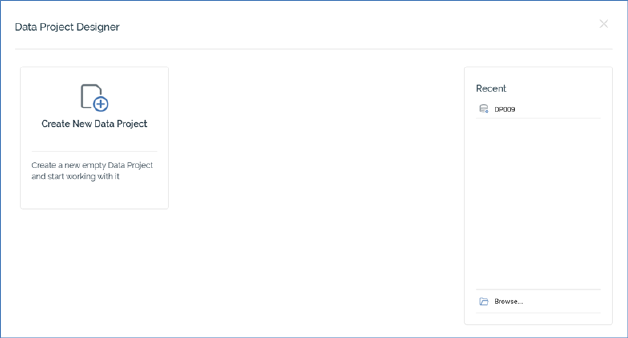 The Data Project Designer Start Page is shown upon invocation of Data Projects at the quick access menu, and also on clicking Create new Data Project at the Data Project Designer toolbar. It contains the following: