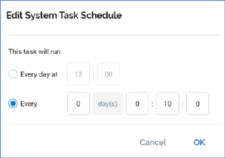 •Edit Schedule: this option, accessible from the Actions button’s menu, is only available if the task is Enabled. It allows you to define when the task will execute. Invocation displays the Edit System Task Schedule dialog.