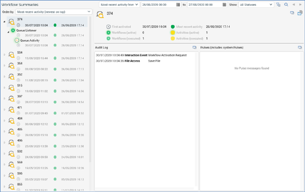 The Workflow Summaries tab gives you the ability to, at a glance, view a summary of those interactions, audiences and data connectors that utilize workflows to effect their execution, and which are or were in given states across a given period of time within the current client’s RPI server installation.